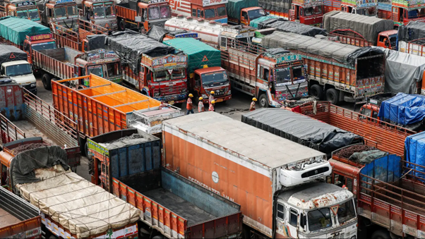 Fig 1: Trucks lined up at a depot. Image: REUTERS/Francis Mascarenhas