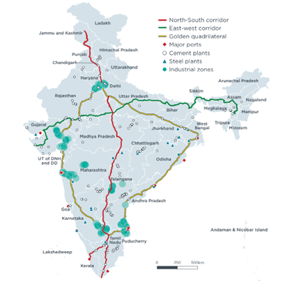 Figure 2: India’s key freight corridors and industrial corridors | Image credit: ICCT